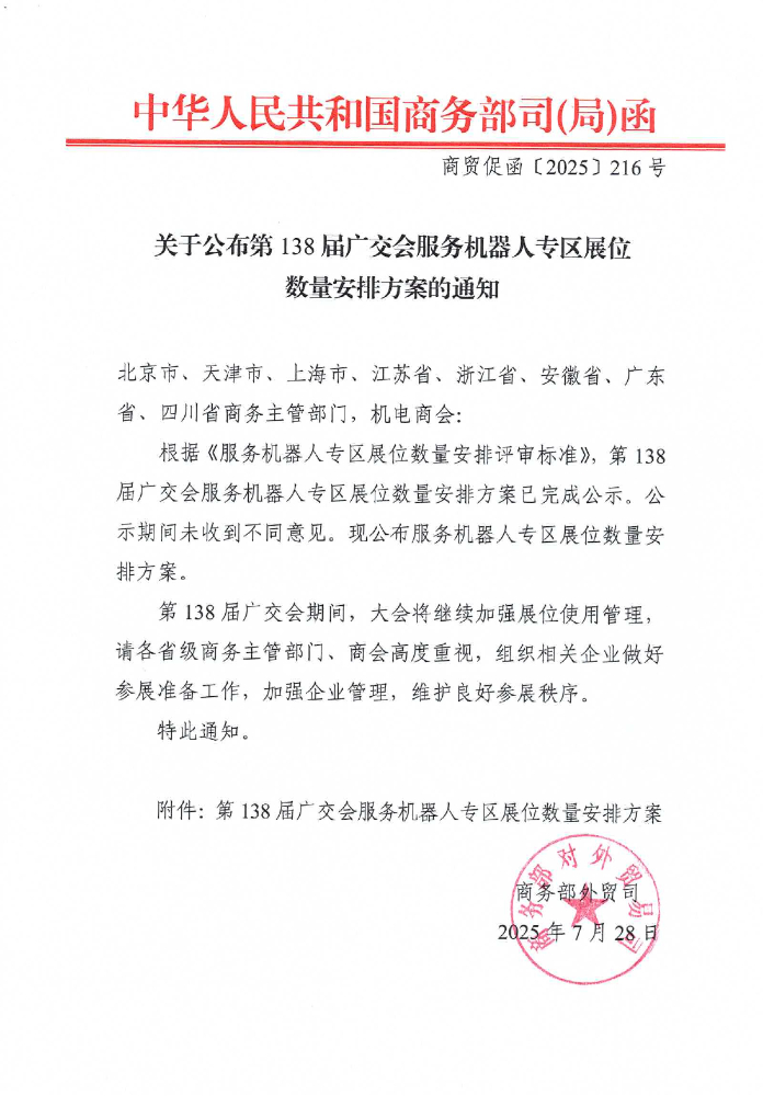 2025年7月28日,商務(wù)部外貿(mào)司發(fā)布了《關(guān)于公布第138屆廣交會服務(wù)機(jī)器人專區(qū)展位數(shù)量安排方案》的通知,第138屆廣交會期間,大會將繼續(xù)加強(qiáng)展位使用管理:請各省級商務(wù)主管部門、商會高度重視,組織相關(guān)企業(yè)做好參展準(zhǔn)備工作,加強(qiáng)企業(yè)管理,維護(hù)良好參展秩序。